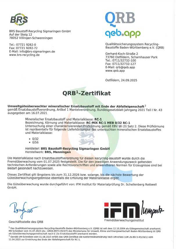 BRS Recycling-Baustoffe Wir führen ausschließlich zertifizierte und umweltüberwachte Recycling-Baustoffe Aktuelle Preisliste öffnen RC-Schotter 32 Körnung: 0-32 mm RC-Schotter 56 Körnung: 0-56 mm RC-Schroppen Körnung: 56-X mm Wir sind Mitglied im QRB e.V. QRB Produktzertifikat – Schotter 0/32 QRB Produktzertifikat – Schotter 0/56